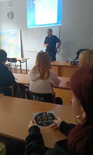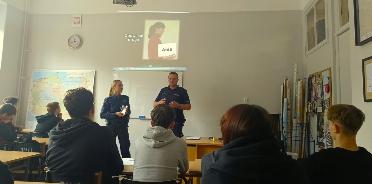 Uczniowie obejrzeli także fragmenty materiałów edukacyjnych przygotowanych przez Policję oraz wysłuchali prawdziwych historii osób, które padły ofiarą tego przestępstwa. Spotkanie miało na celu nie tylko przekazanie wiedzy, ale również zachęcenie młodzieży do refleksji i odpowiedzialnych wyborów.