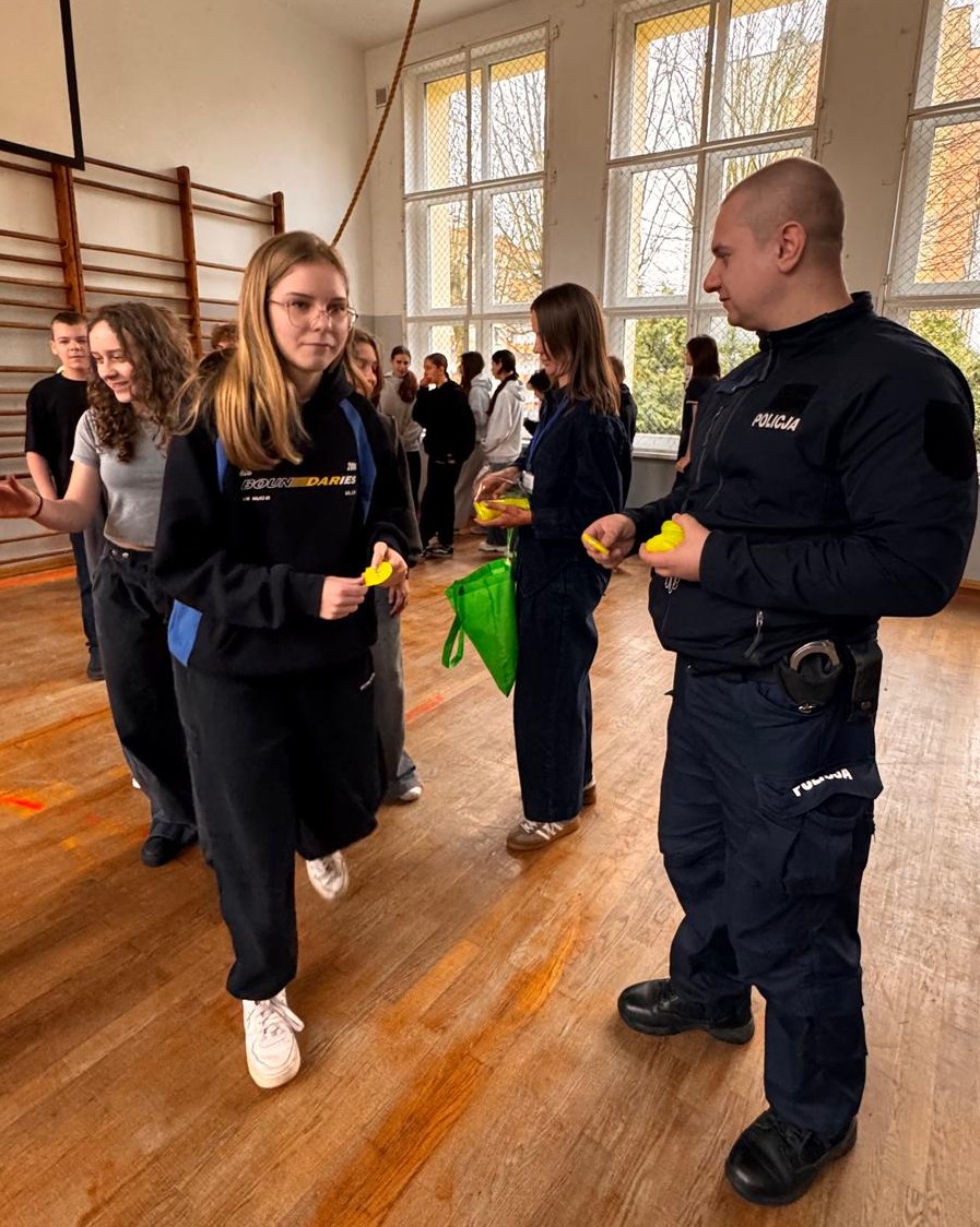 Podczas praktycznej części zajęć uczniowie dowiedzieli się, jak prawidłowo przechodzić przez jezdnię, jak zachowywać się w pobliżu drogi oraz dlaczego noszenie elementów odblaskowych może uratować życie. Policjanci tłumaczyli, że pieszy bez odblasku jest widoczny dla kierowcy dopiero z około 20–30 metrów, podczas gdy osoba wyposażona w odblask może zostać zauważona już z odległości 150–200 metrów.