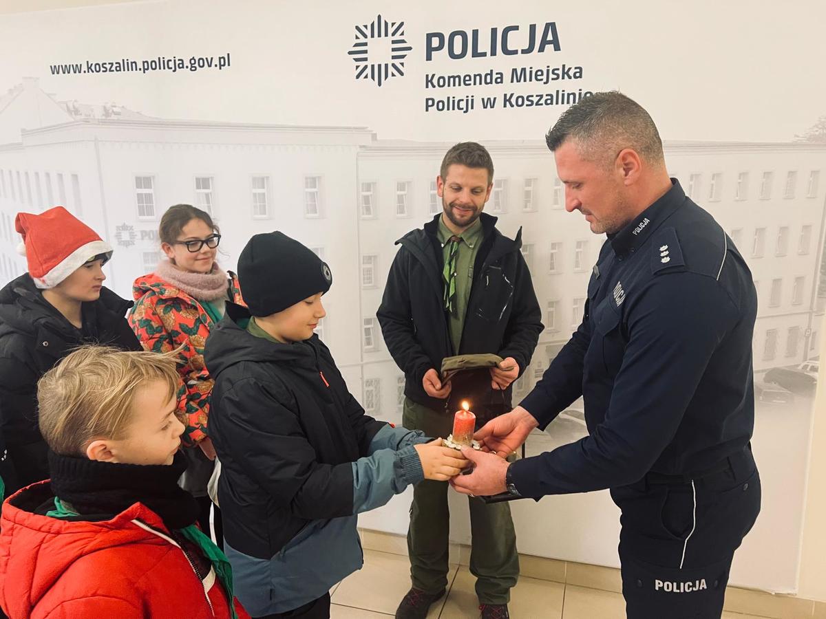Betlejemskie Światło Pokoju to symbol ciepła, miłości, pokoju i nadziei, który za pośrednictwem harcerzy wędruje po całej Europie. Jak co roku dotarło też do siedziby Komendy Miejskiej Policji w Koszalinie. Wraz z podziękowaniem za pamięć o wszystkich policjantach, którzy na co dzień pełnią służbę w powiecie koszalińskim policjanci harcerzom złożyli najlepsze życzenia świąteczno-noworoczne.