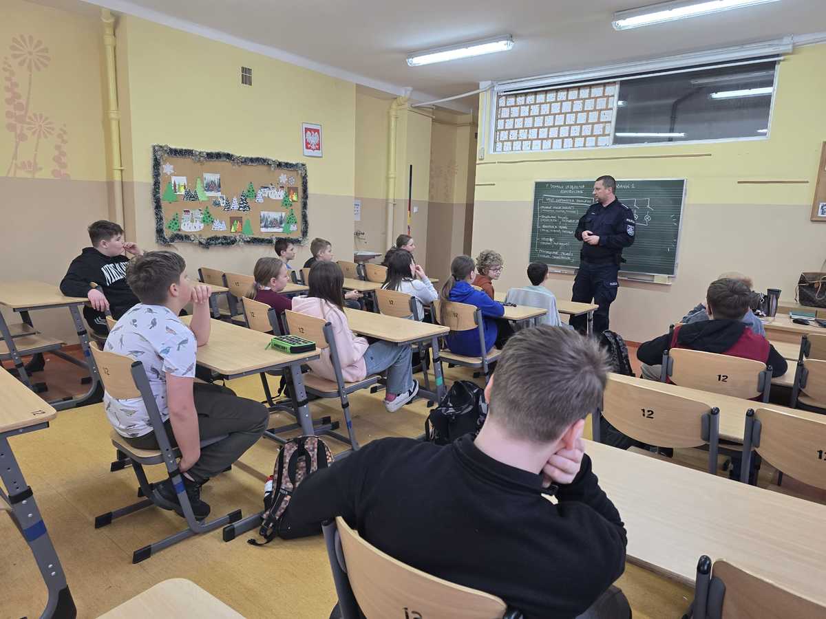 Kolejnym, równie istotnym tematem była przemoc rówieśnicza. Policjanci tłumaczyli, jak rozpoznać różnego rodzaju sytuacje przemocy, jak właściwie na nie reagować i dlaczego tak ważne jest, aby nie być biernym świadkiem.