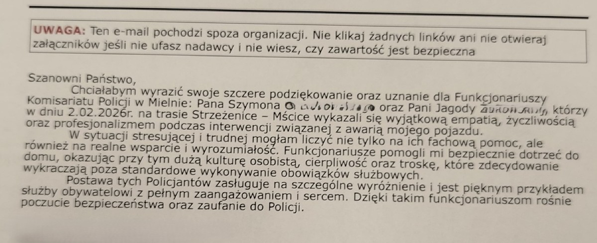 Policjanci z Komisariatu Policji w Mielnie podczas patrolowania w miejscowości Strzeżenice zauważyli na środku jezdni unieruchomiony pojazd. Funkcjonariusze od razu zainteresowali się sytuacją, przypuszczając, że kierująca może potrzebować pomocy. Czujność i szybka reakcja mundurowych pozwoliła kierującej bezpiecznie dotrzeć do domu.