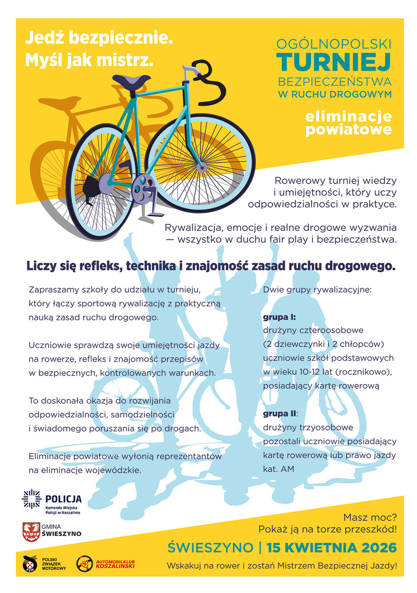 Już 15 kwietnia 2026 roku w Szkole Podstawowej w Świeszynie odbędą się eliminacje powiatowe do Ogólnopolskiego Turnieju Bezpieczeństwa w Ruchu Drogowym. Wydarzenie skierowane jest do uczniów szkół podstawowych i ma na celu promowanie bezpiecznych zachowań na drodze oraz rozwijanie praktycznych umiejętności uczestników ruchu drogowego.